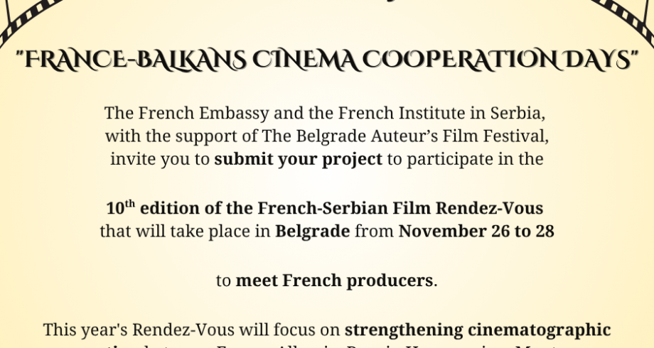 Francuska ambasada i Francuski institut u Srbiji, uz podršku Festivala autorskog filma (FAF), objavljuje poziv za prijave za učešće na 10. izdanju Francusko-srpskih filmskih susreta, koji će biti održani od 26. do 28. novembra 2025. godine u Beogradu.